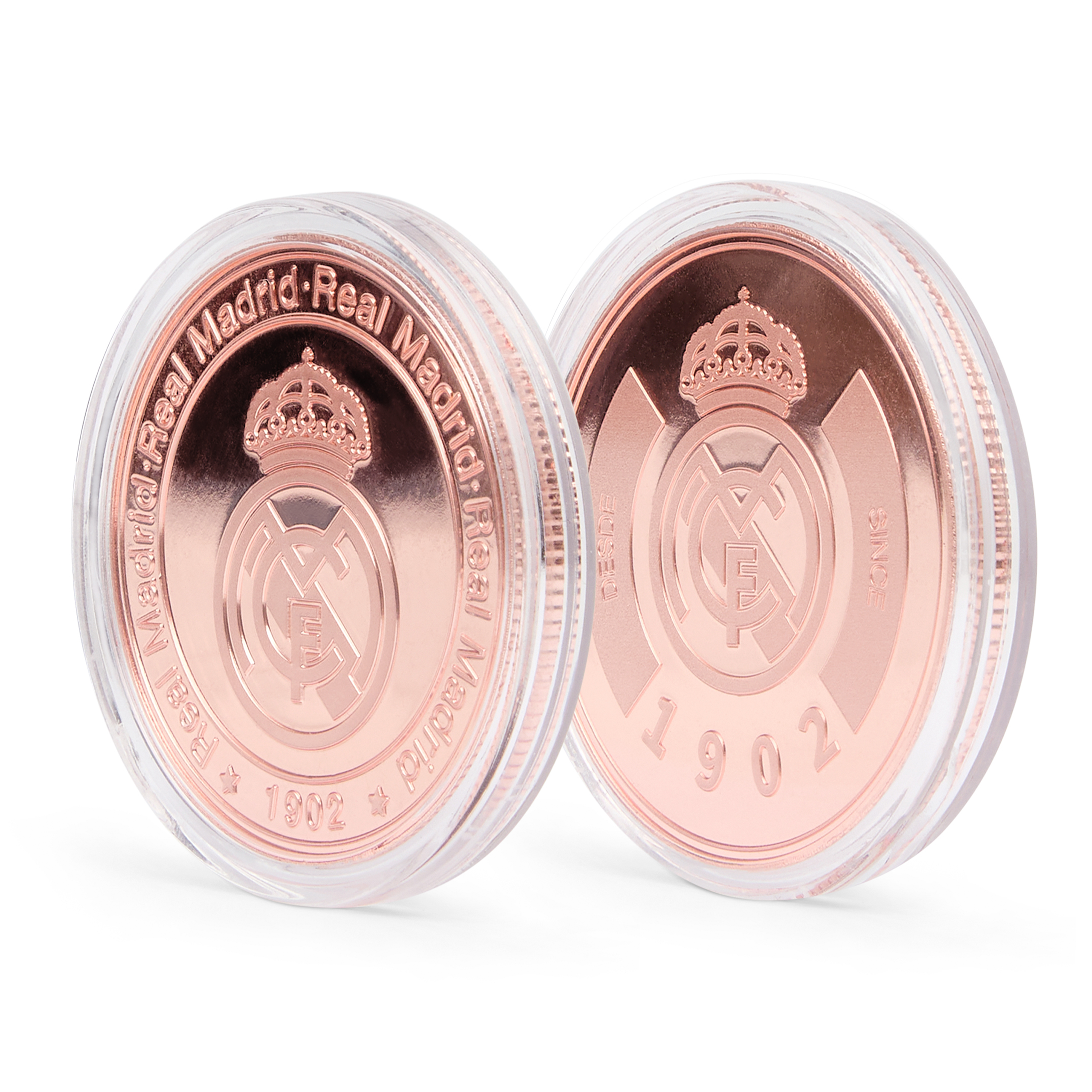 Con la inscripción "1902" en el anverso y el escudo del Real Madrid en el reverso, esta moneda de 4 cm de diámetro es una pieza de colección cargada de historia y emoción. Se presenta en cápsula acrílica, con tarjeta soporte del Real Madrid dentro de un estuche individual oficial.