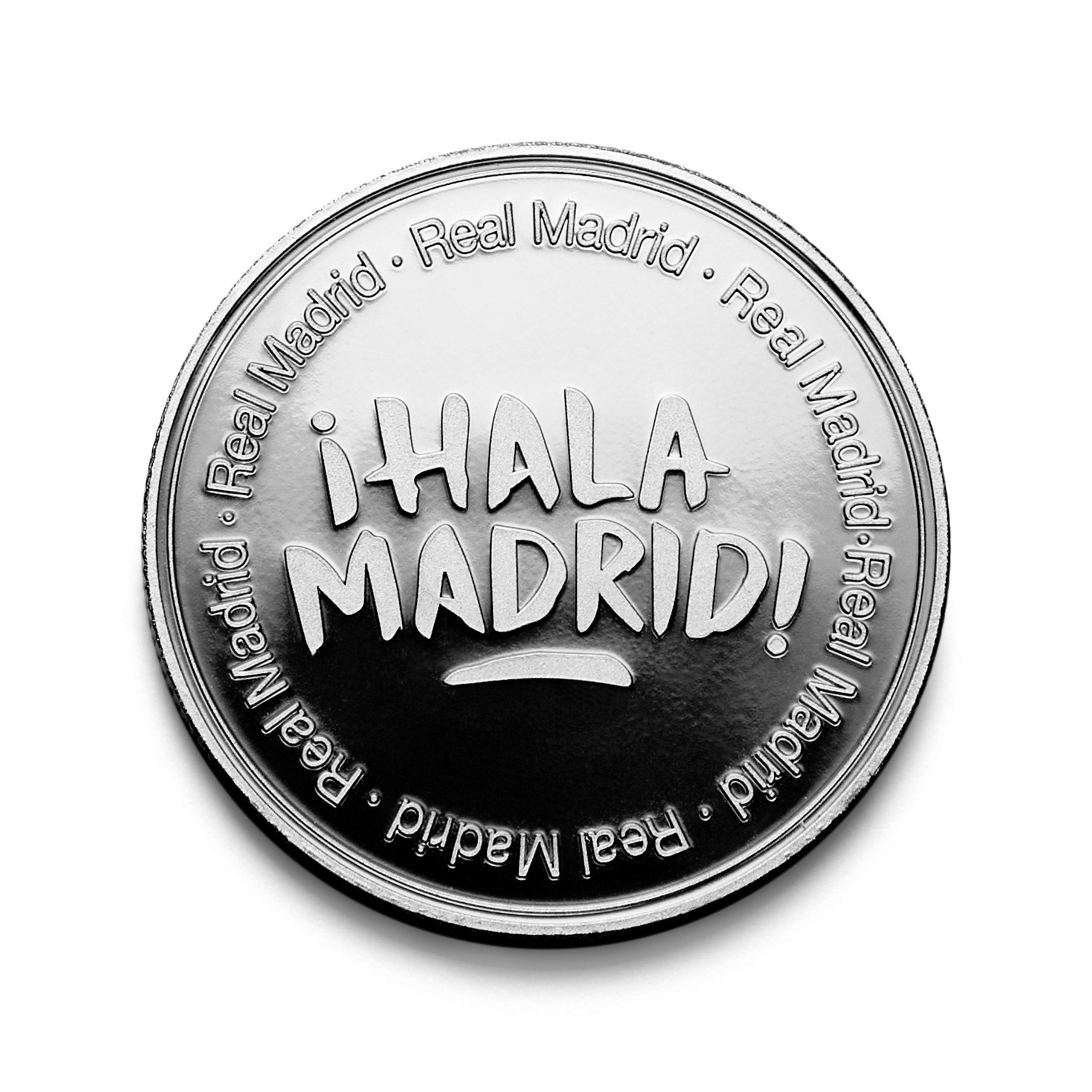 Con el lema "¡Hala Madrid!" en el anverso y el escudo oficial del club en el reverso, esta moneda de 4 cm de diámetro es una pieza de colección que late al ritmo del Santiago Bernabéu. Se presenta en cápsula acrílica, con tarjeta soporte del Real Madrid dentro de un estuche individual oficial.